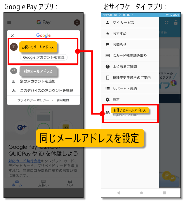 おサイフケータイ アプリに設定するGoogleアカウントは1つとし、Google ウォレットアプリでも同アカウントのみを設定してご利用ください。